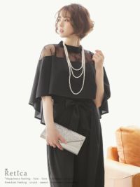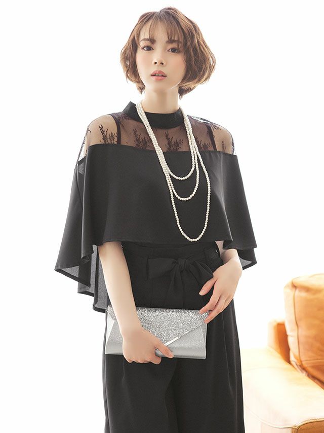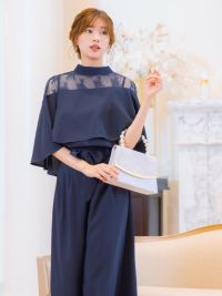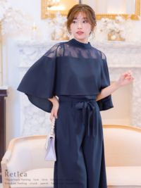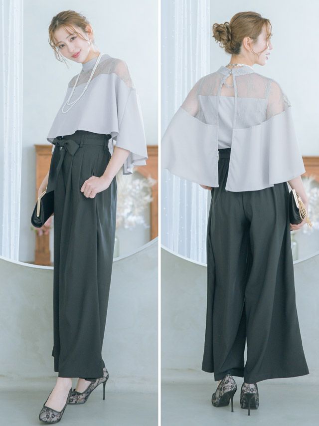 3. [SALE] ハイネックレースケープデザインウエストリボンワイドパンツパーティードレス (Sサイズ~3Lサイズ)