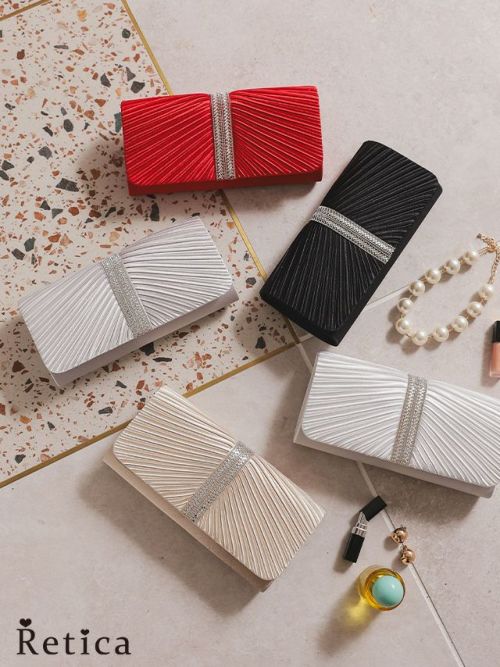 3. ラインストーンギャザー 2wayプリーツクラッチバッグ(ベージュ/シルバー/ブラック/ホワイト/レッド)