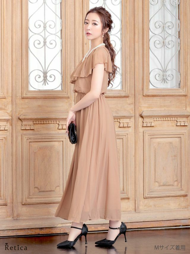5. 半袖フリルシフォンウエストゴムロングパーティードレス (Sサイズ~XXLサイズ)