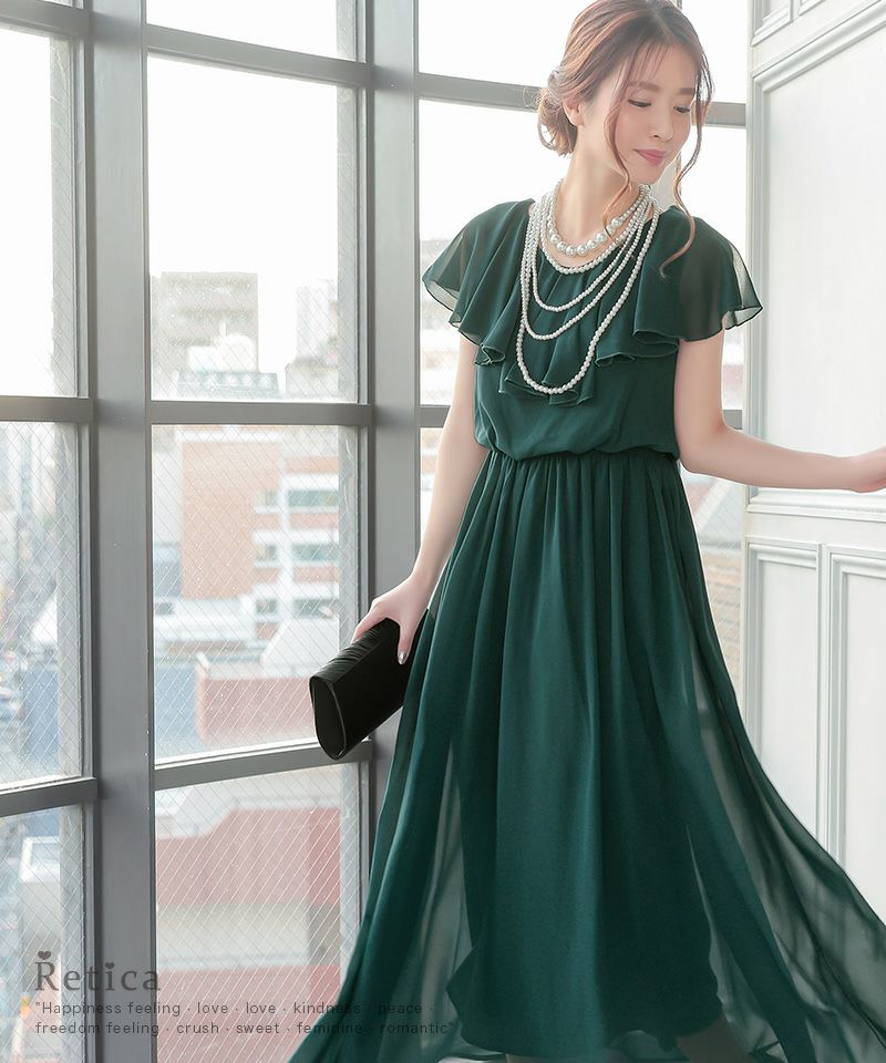 パーティードレス 結婚式 フォーマル 半袖フリルシフォンウエストゴムロングワンピースドレス