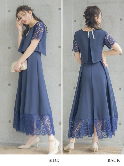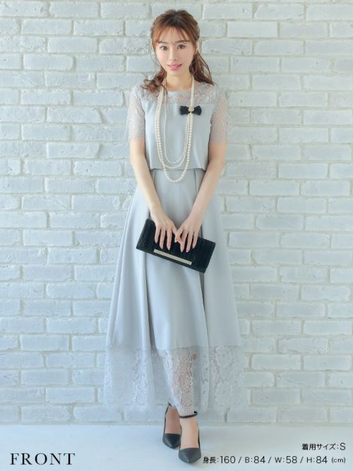 レース半袖フレアスカートロング丈ワンピースパーティードレスのサイドバッグ全身