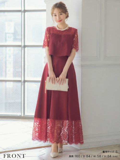 女性らしいライン♪ レース袖ありロングシンプルレーススカートパーティードレス (XSサイズ~XXXLサイズ)
