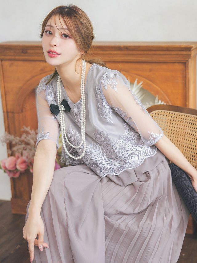 5. [SALE] 七分袖エンブロイダリーフラワーレースドレープシフォンワイドパンツセットアップパーティードレス (Sサイズ~Lサイズ)(大川藍)