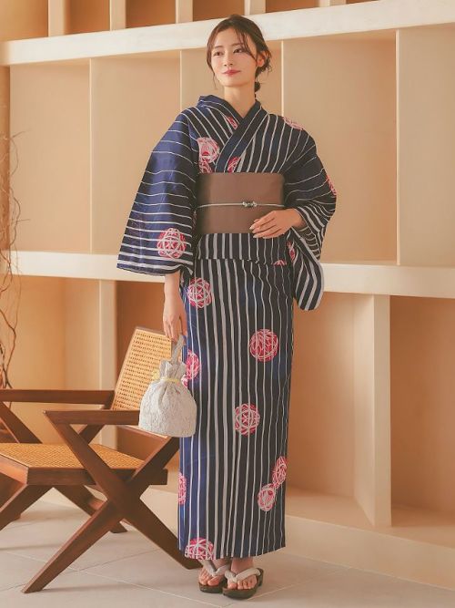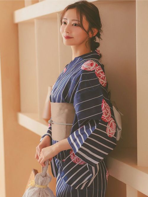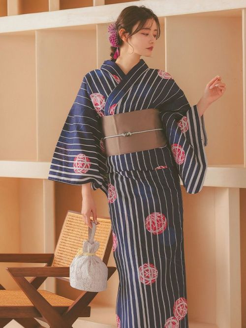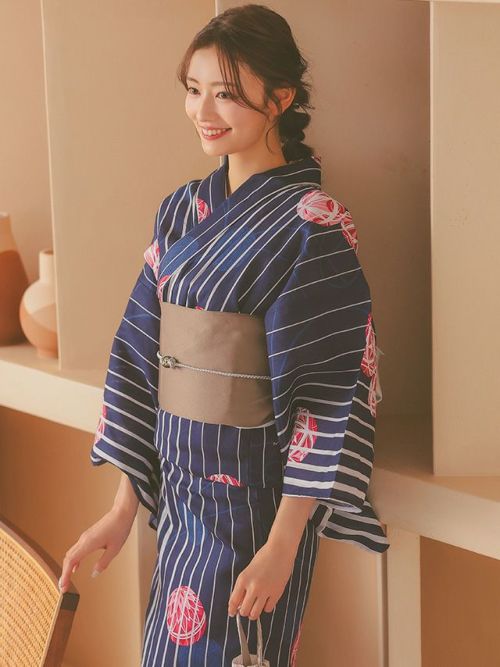 3. 高級綿麻 リネン素材 吸湿性・通気性 紺生地白ストライプ×鞠デザインレディース浴衣3点セット(浴衣+平帯or作り帯+下駄)