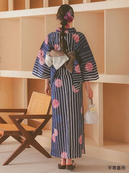 紺生地白ストライプ×鞠デザインレディース浴衣3点セットのイメージ画像2