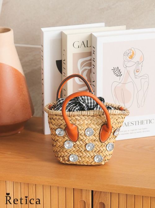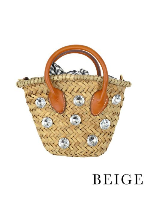 大きめビジューがかわいい♪ [SALE] ビジュー付き白黒ギンガムチェック巾着かごバッグ