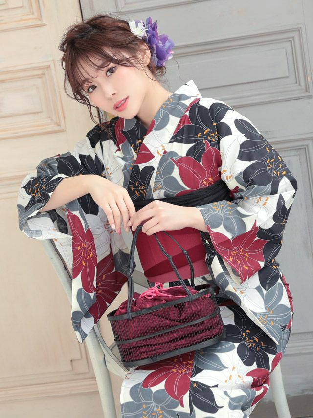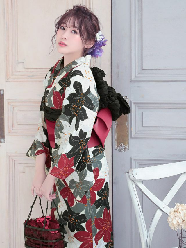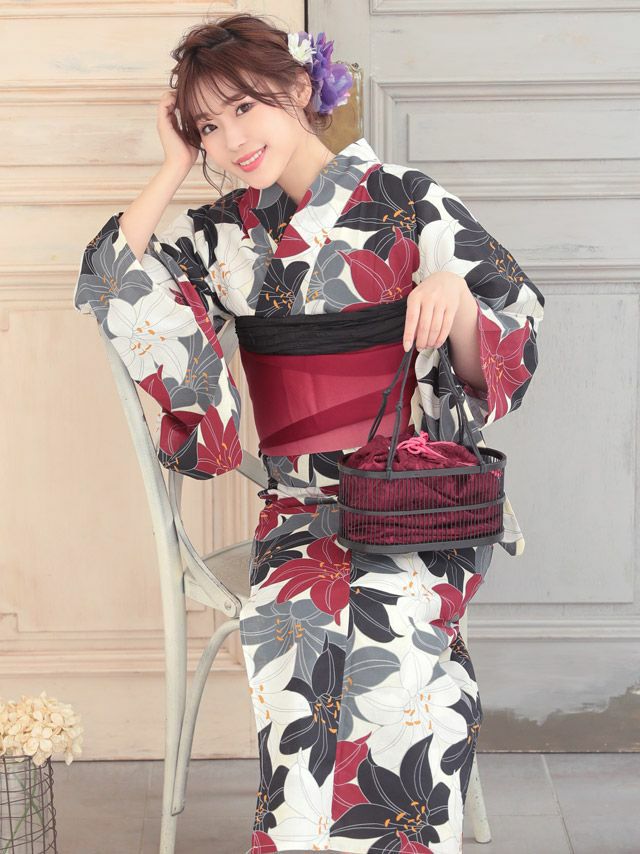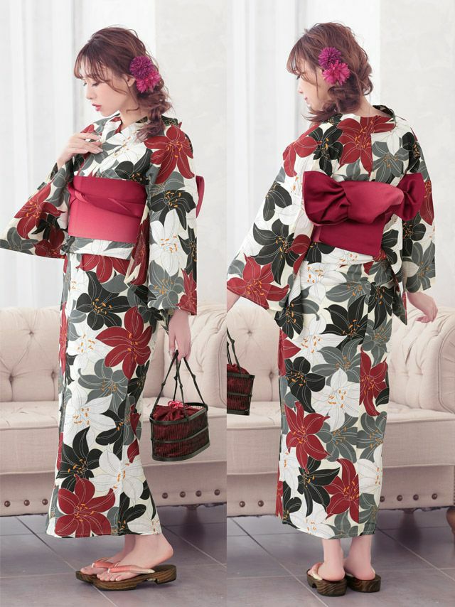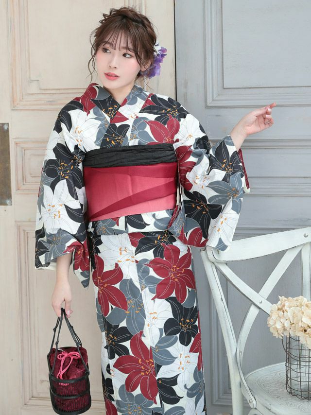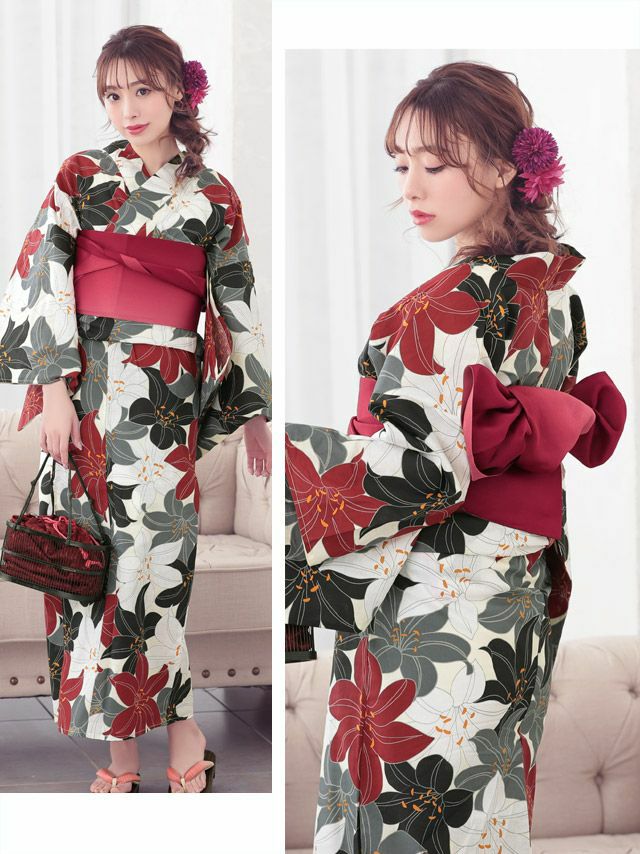 3. 華やか百合柄 浴衣3点セット(浴衣+平帯or作り帯+下駄)