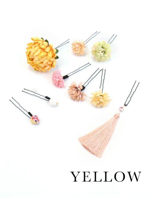 遠くからでも目を惹く♪ タッセル付きカラフルフラワー浴衣ヘアアクセサリー9点セット (イエロー)