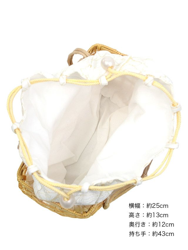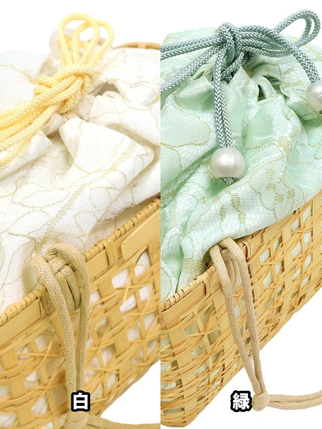 大人可愛いパールの飾り付き浴衣にぴったりなかご巾着バッグ かご巾着バッグ(ホワイト/グリーン)