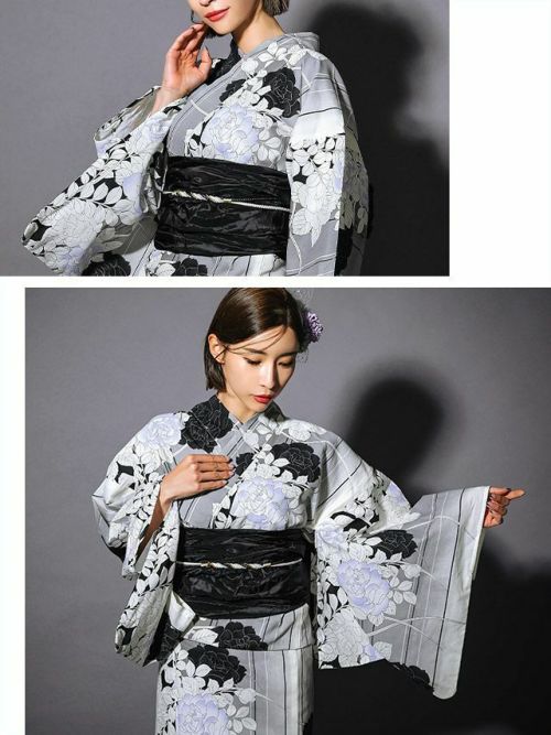 3. 変わり細縞×モノトーンローズ 大人の3点セットレディース浴衣(浴衣+兵児帯+下駄)