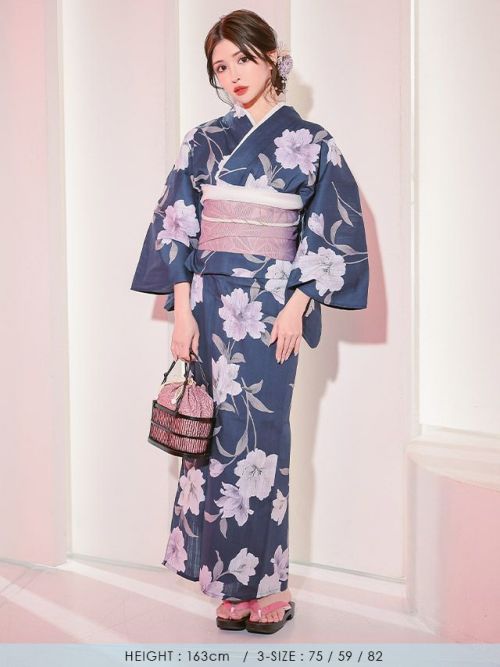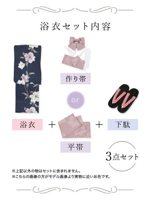 3. 紺地に水彩百合 大人の3点セットレディース浴衣(浴衣+平帯or作り帯+下駄)