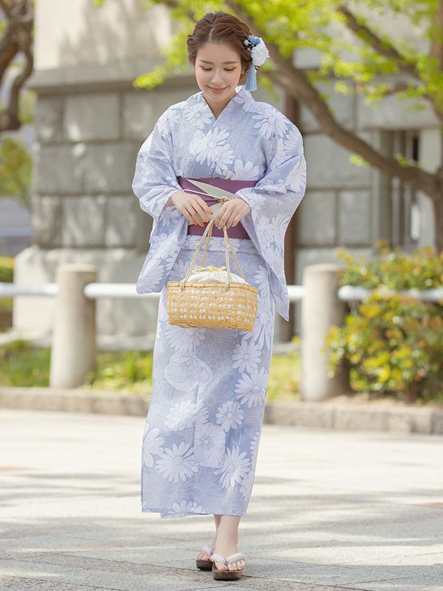 3. マーガレット柄 浴衣3点セット(浴衣+平帯or作り帯+下駄)ブルーグレー