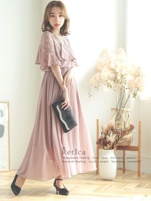 フリル×レースワンカラーシフォンロングパーティードレス (Sサイズ~4Lサイズ)