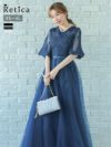 レース切替デザイン五分袖シフォンフレアロングスカートパーティードレス (Sサイズ~4Lサイズ)