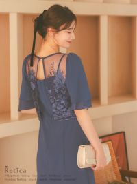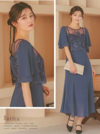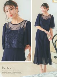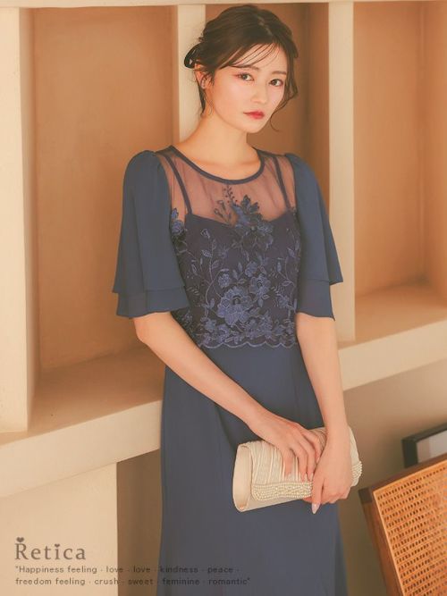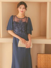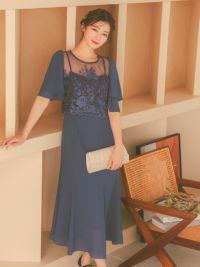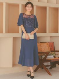 花柄刺繍が目を引く♪ 花柄刺繍シアーレース切り替えワンピースパーティードレス (Sサイズ~3Lサイズ)