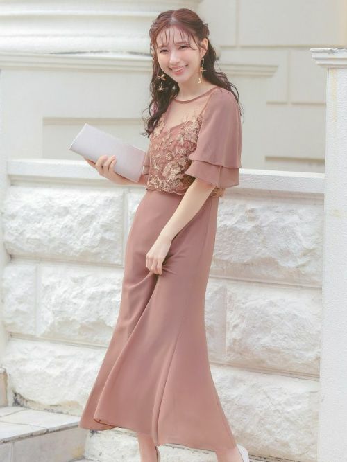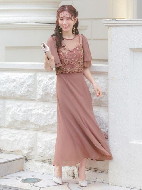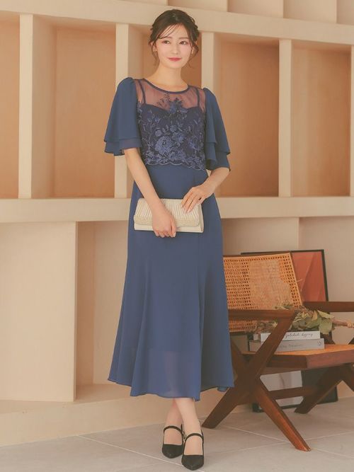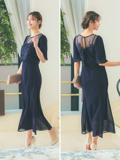 花柄刺繍シアーレース切り替えワンピースパーティードレスのフロント全身
