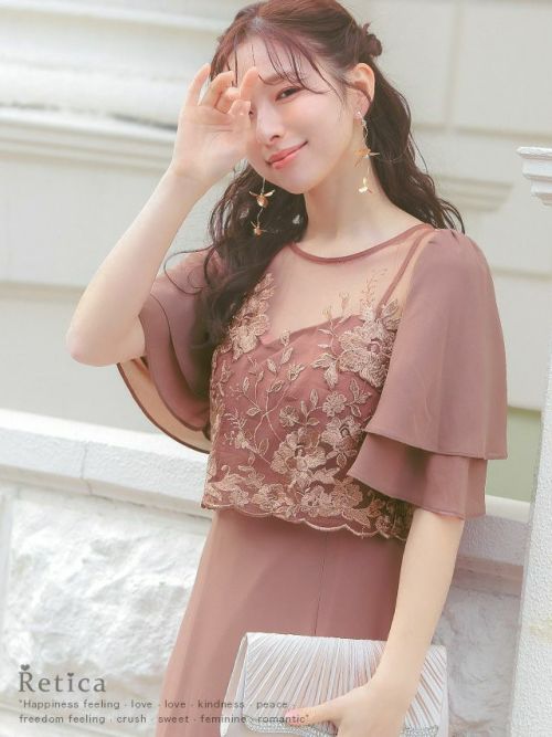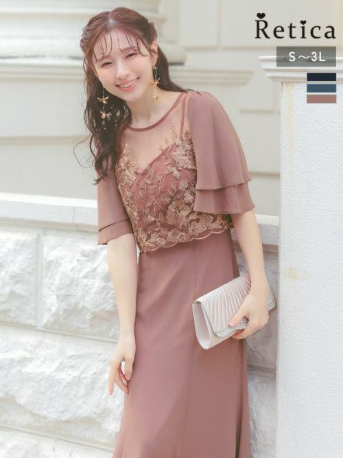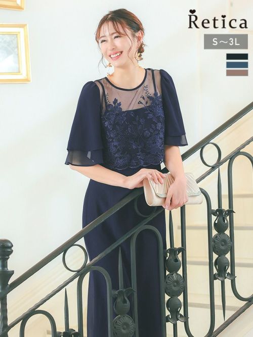 3. 花柄刺繍シアーレース切り替えワンピースパーティードレス (Sサイズ~3Lサイズ)