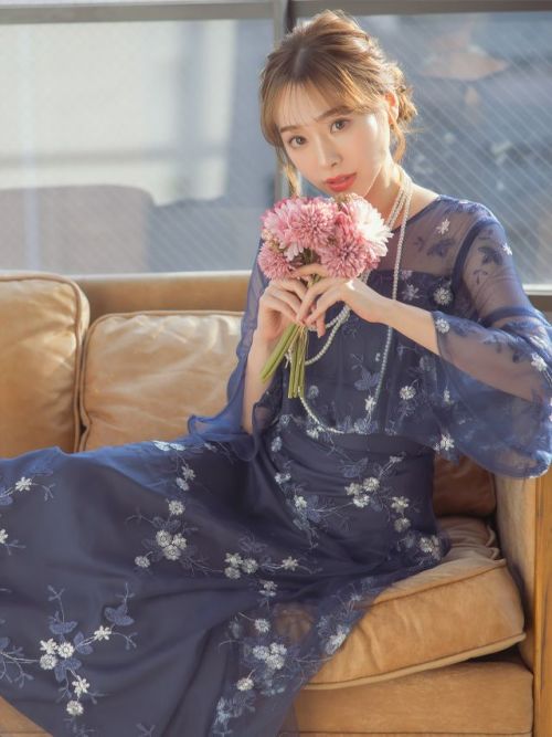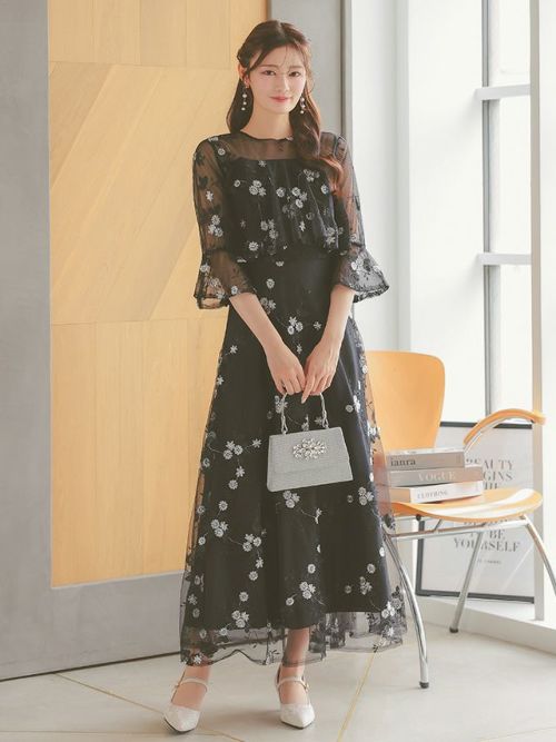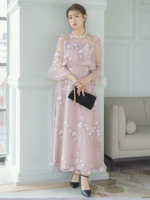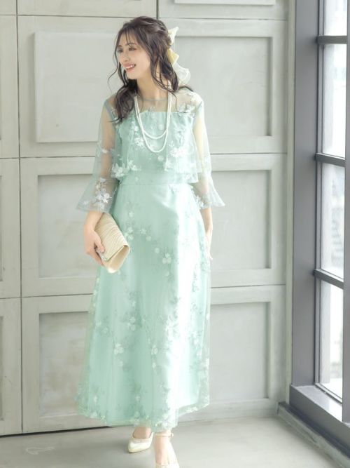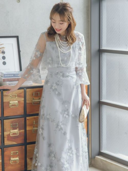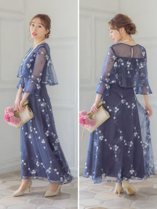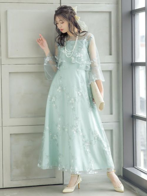 5. 花刺繍チュールデザインロング丈パーティードレス (XSサイズ~4Lサイズ)<高身長サイズあり>