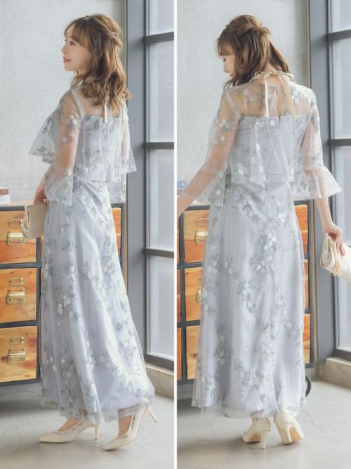 3. 花刺繍チュールデザインロング丈パーティードレス (XSサイズ~4Lサイズ)<高身長サイズあり>