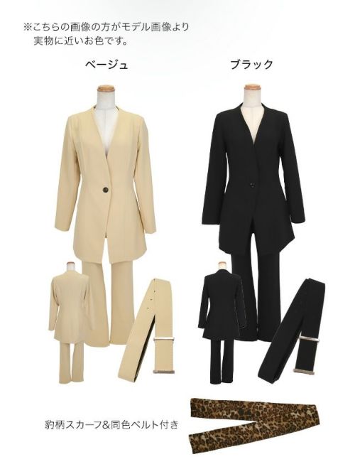 上品なウエストライン♪ [SALE] ノーカラーVネックジャケット×豹柄スカーフ&同色ベルト付きパンツセットアップセレモニースーツ (Sサイズ~XLサイズ) (ブラック/ベージュ)