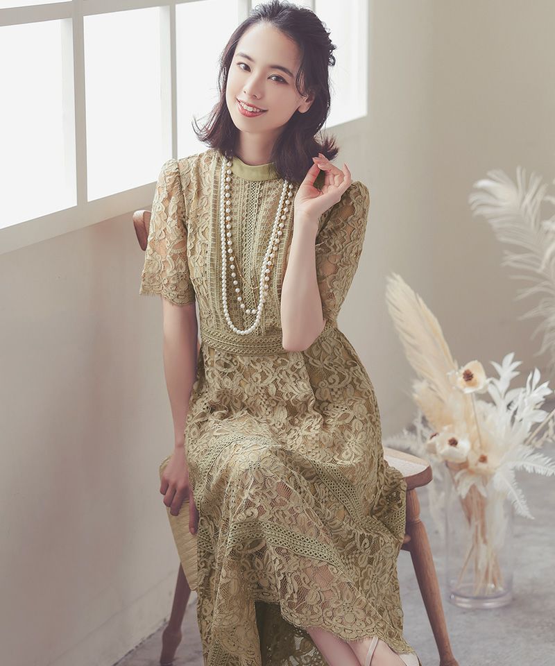 優雅なケミカルはしごレースのヘムミモレワンピース