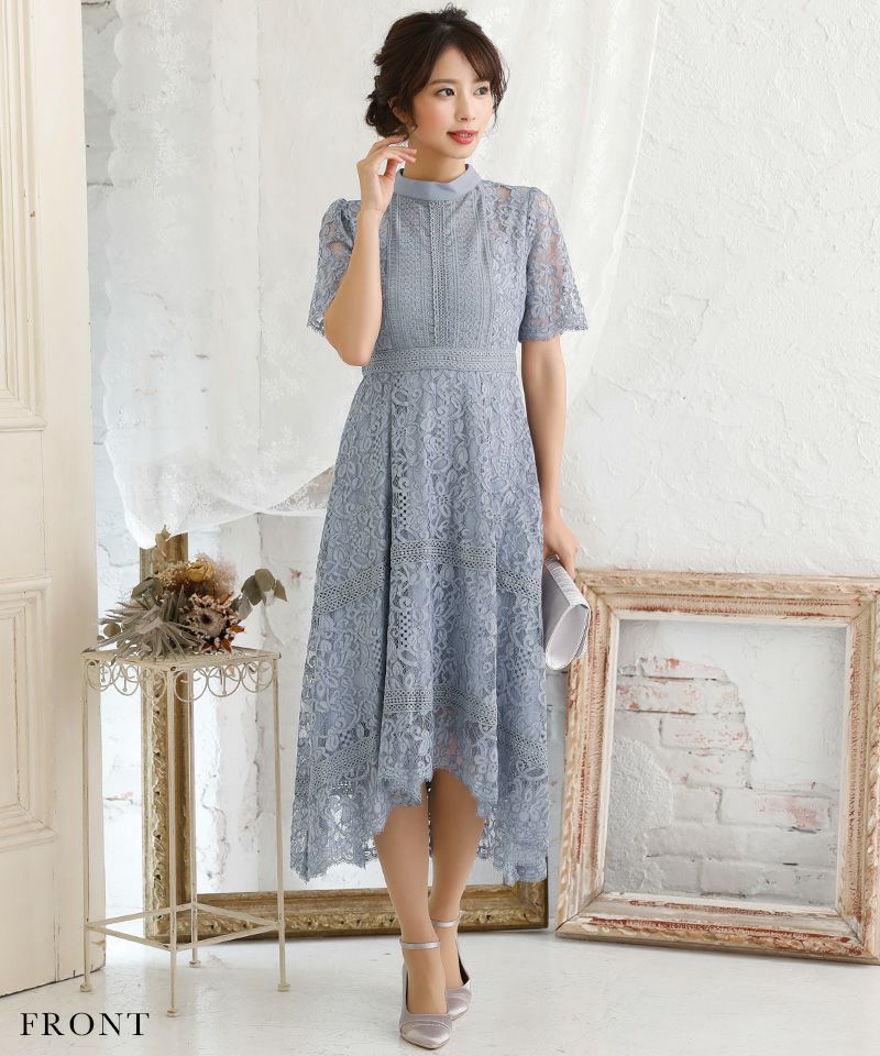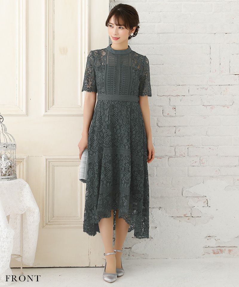 総レース&はしご切替イレヘムミモレ丈パーティードレスのフロント全身