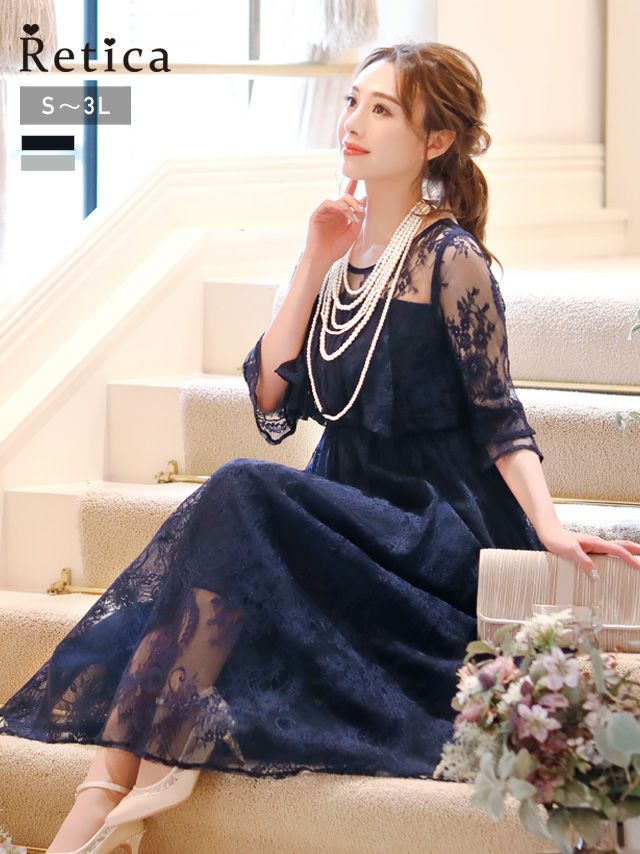 ふわっと優しい印象に♪ [SALE] 五分袖ロング丈総レースワンピースパーティードレス (Sサイズ~XXLサイズ)
