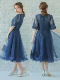立体刺繍重ねチュール五分袖ミモレ丈ワンピースパーティードレスのカラーバリエーション