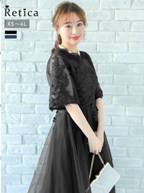 4. [SALE] 立体刺繍重ねチュール五分袖ミモレ丈ワンピースパーティードレス (XSサイズ~4Lサイズ)