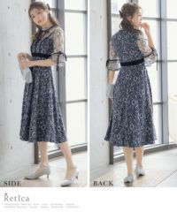 4. チョーカー風デザイン刺繍レース×リボンフリル袖ミディアム丈パーティードレス (Sサイズ~XLサイズ)