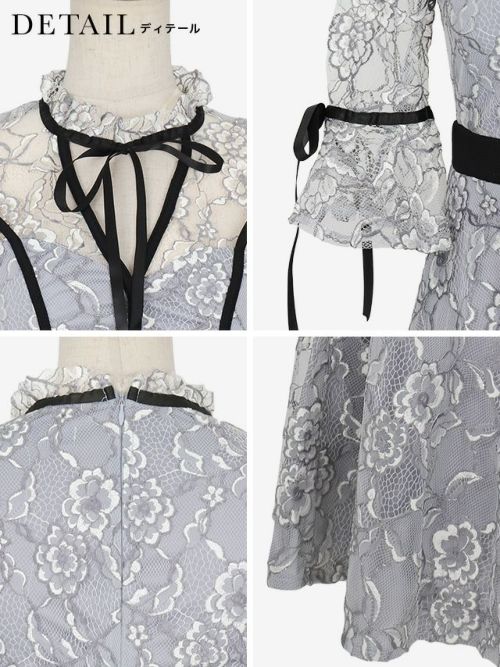 チョーカー風デザイン刺繍レース×リボンフリル袖ミディアム丈パーティードレスの商品詳細1