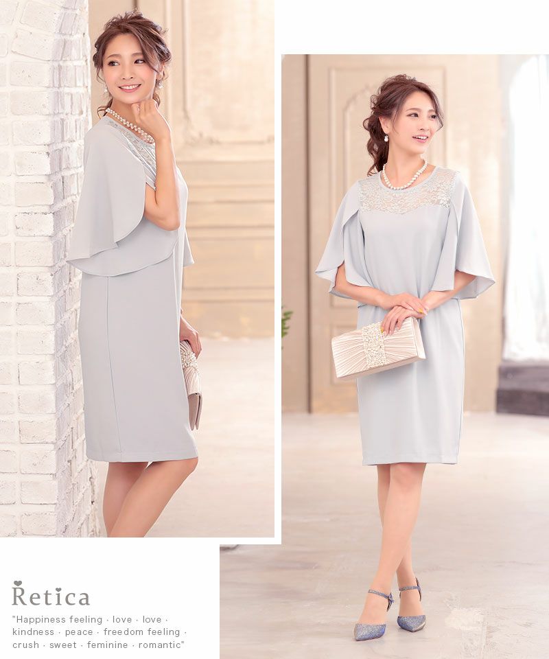 フレアケープ風スリーブデコルテレース切替フレアミニパーティードレスカラーバリエーション