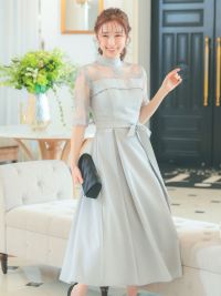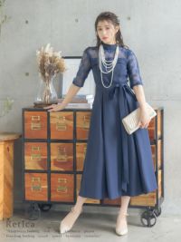 5. [SALE] ハイネックレース七分袖ミモレ丈パーティードレス (XSサイズ~4Lサイズ)