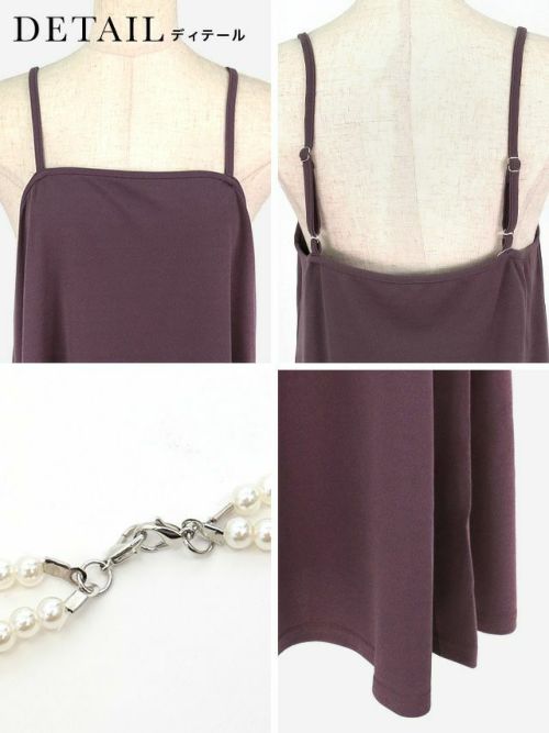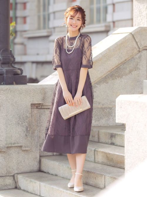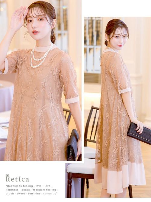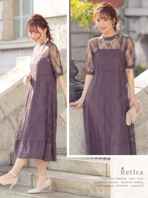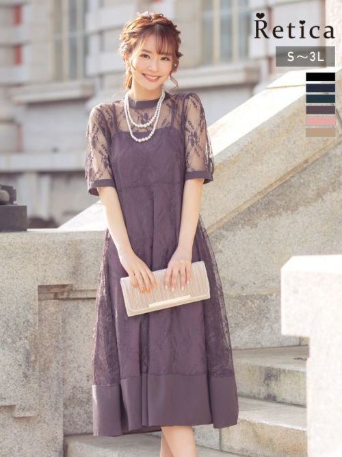 4. [SALE] 半袖レースレイヤード膝丈ワンピースパーティードレス [パールネックレス付き] (Sサイズ~3Lサイズ)