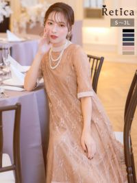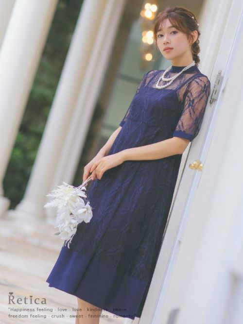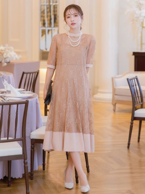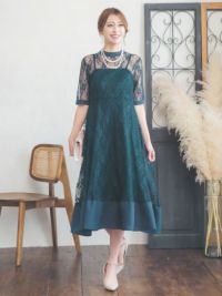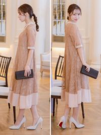 5. [SALE] 半袖レースレイヤード膝丈ワンピースパーティードレス [パールネックレス付き] (Sサイズ~3Lサイズ)