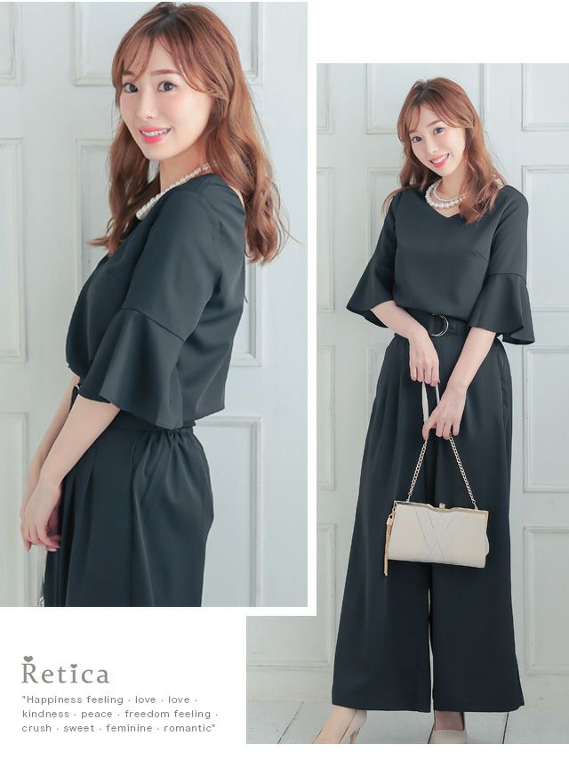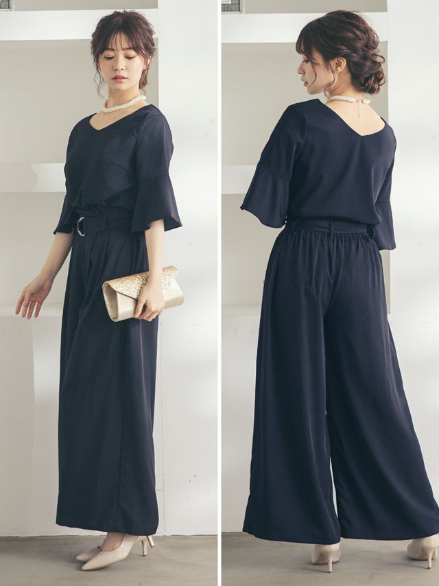 お呼ばれドレス パンツ ワイドVネックベルスリーブパンツセットアップパーティードレス