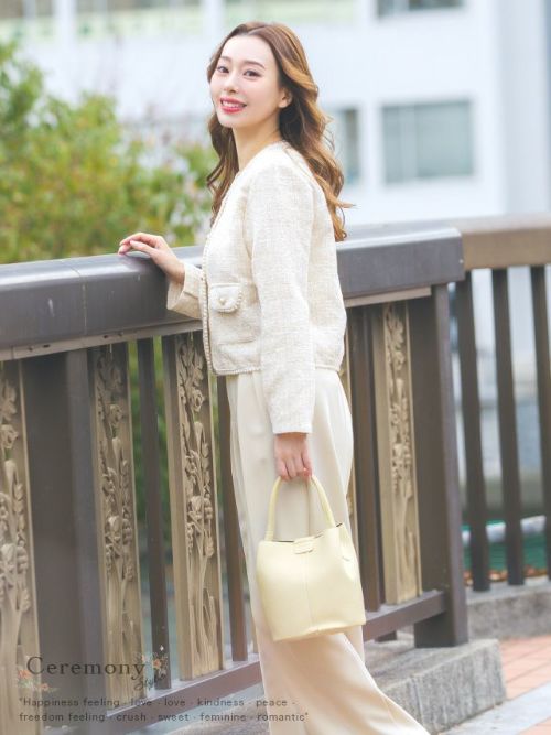 ツイード調パールボタン付き2ピースセットアップセレモニースーツのイメージ画像1