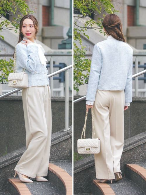 ツイード調パールボタン付き2ピースセットアップセレモニースーツのサイドバッグ全身