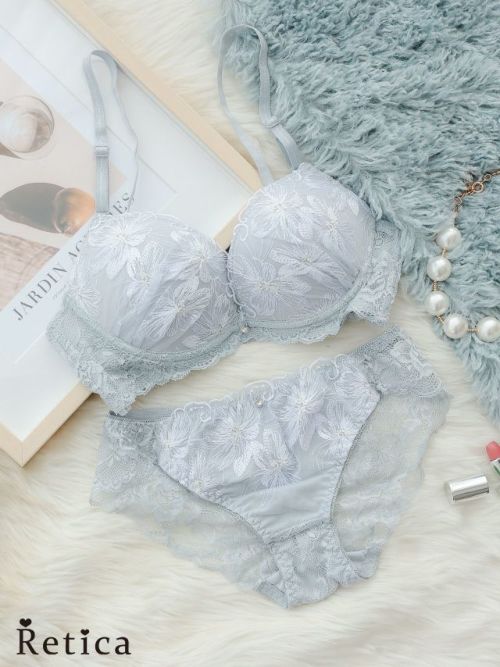 4. ホワイトリリー刺繍レースブラジャー&ショーツセット(ブルーグレー)(A~D/70~75)