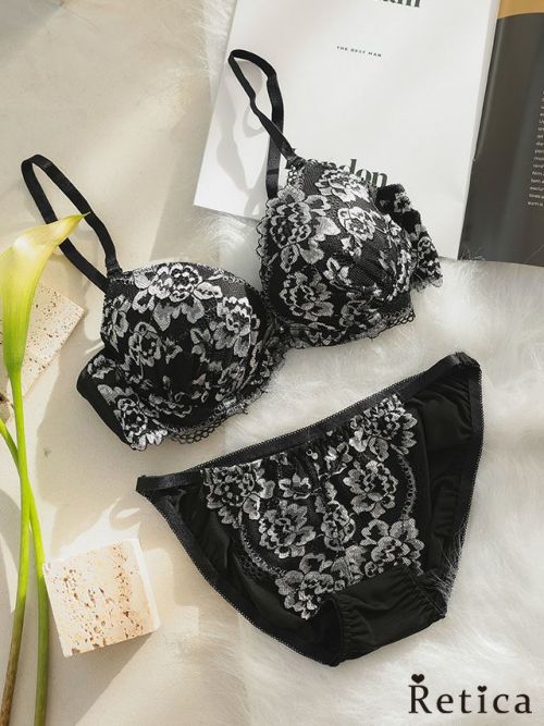 シルバーの刺繍がエレガント♪ フラワー刺繍エレガントブラジャー&ショーツセット(ブラック)(A~F/70~75)
