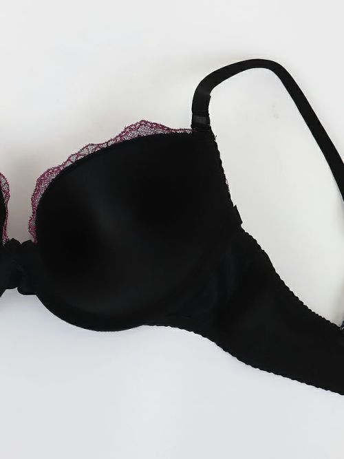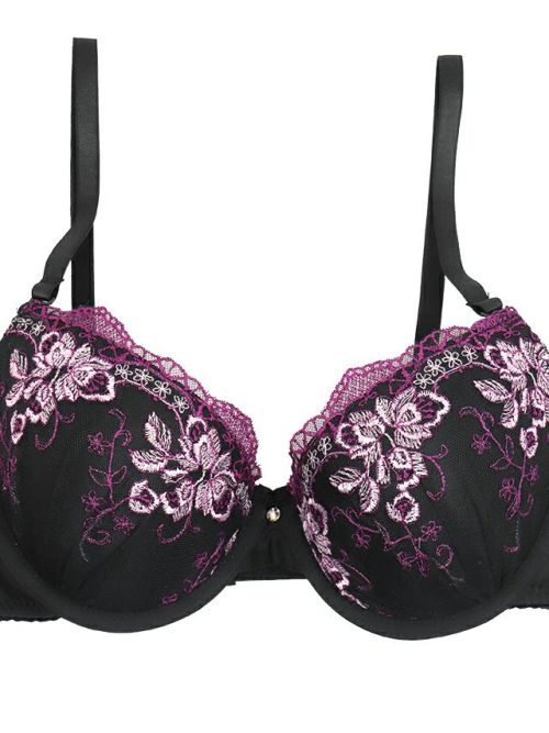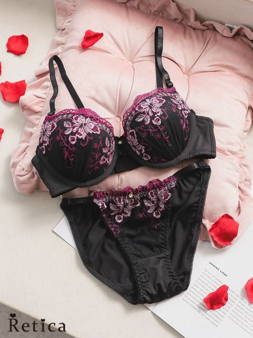 刺繍が際立つ配色♪ フラワーリーフ刺繍レースブラジャー&ショーツセット(ブラック×ピンク)(A~F/65~80)