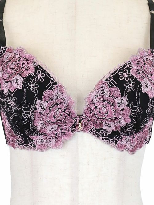 4. エレガントフラワー刺繍ビジュー付き脇高ブラジャー&ショーツセット(ブラック)(A~F /65~80))