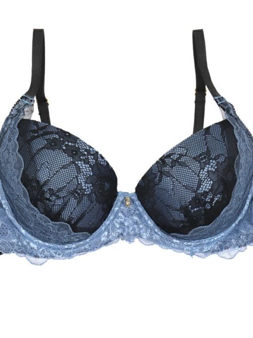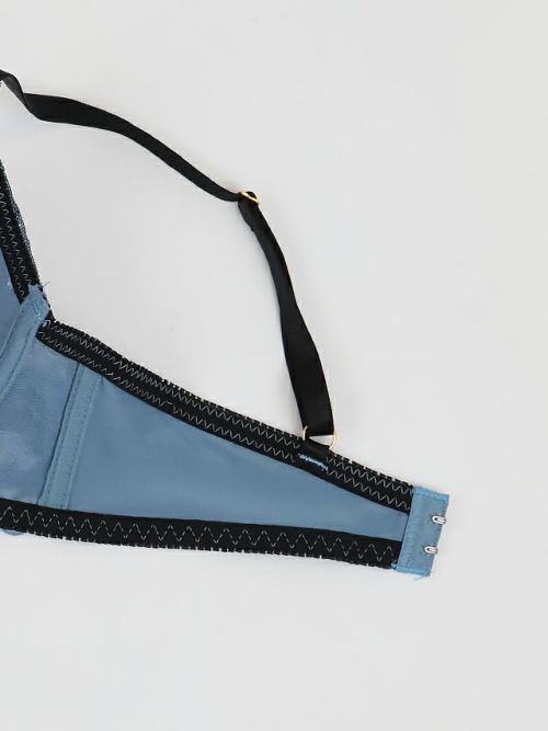 3. ブラックレース切り替えカップブラジャー&ビジュ付きフリルチュールショーツセット(ダスティブルー)(A~F/65~75)