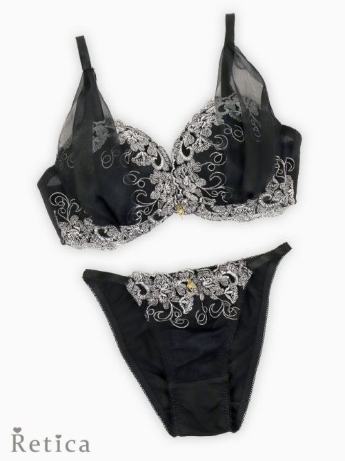 4. チュールベールエレガンス刺繍レース脇高カップブラジャー&ショーツセット(ブラック)(A~F/65~75)