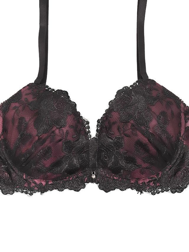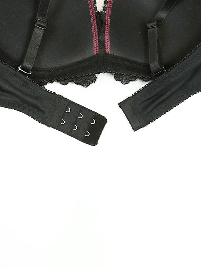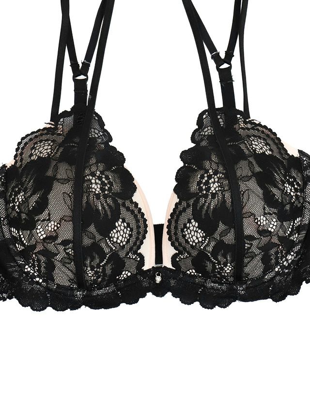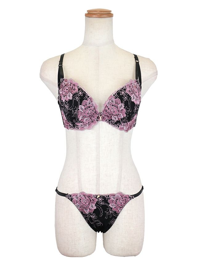 ブラック×ピンクな甘辛ランジェリー♪ ラブリーピンクフラワー刺繍フロントホックカップブラジャー&ショーツセット(ブラック)(A~F/65~80)