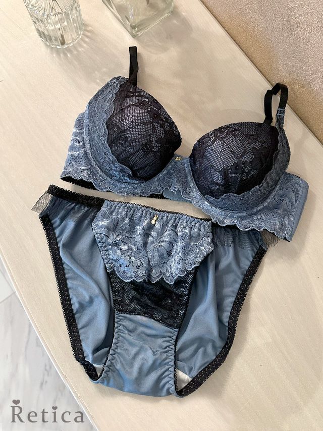 惹き込まれそうな深い青が魅力♪ ビジュー付きクラシカルフラワーレースコードブラジャー&ショーツセット(ブラック×ブルー)(A~F/65~75)
